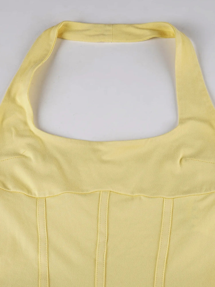 The Ruffled Halter Mini Dress brings sunshine to your wardrobe. With a sculpted bodice and flirty layered skirt, it's your go-to for golden hour, beach dates, or rooftop drinks.