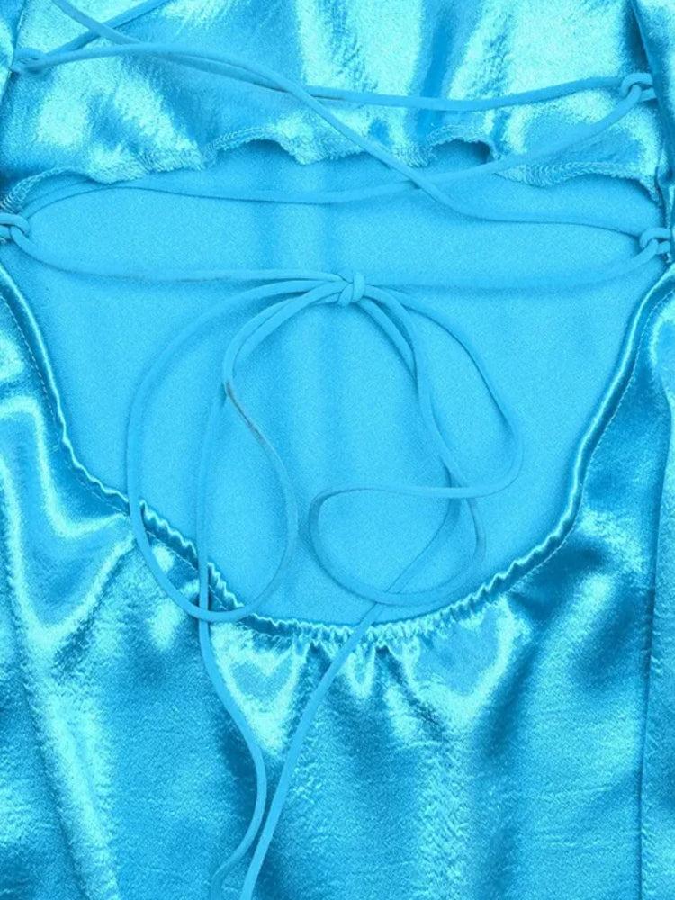 Make a shimmering entrance in this Satin Lace Up Backless Mini Dress. Featuring a soft aqua and sky blue color combo, this sultry silhouette is designed with a twist-front bodice, a curve-skimming satin skirt, and an eye-catching lace-up back that demands attention from every angle.