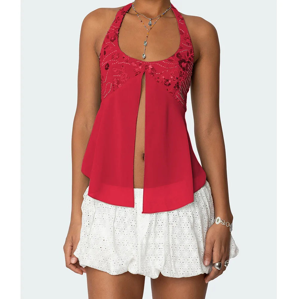Pearl Embellished Sequins Halter Backless Cami Top