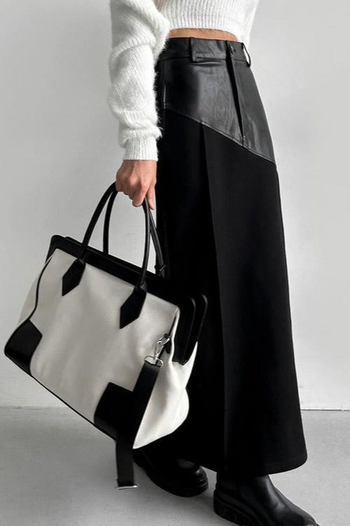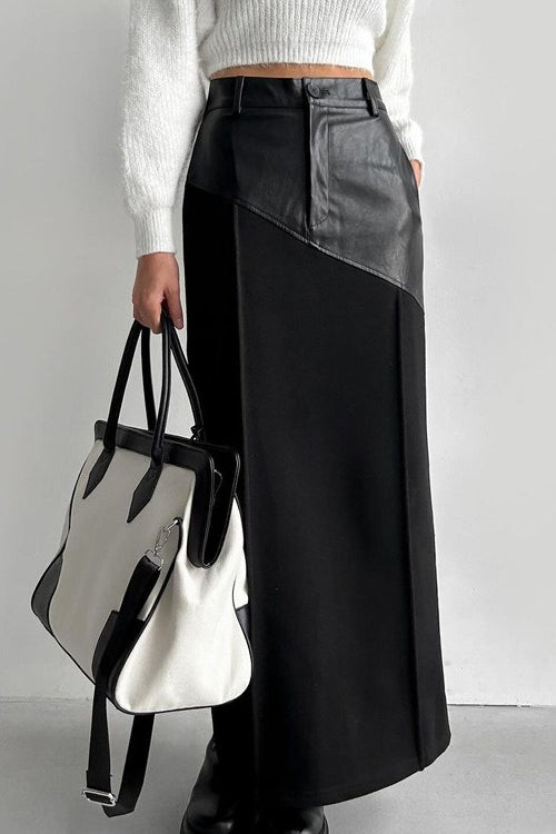 PU Leather Panel High Waist Slit Skirt