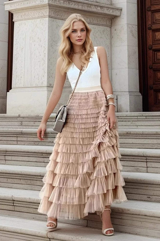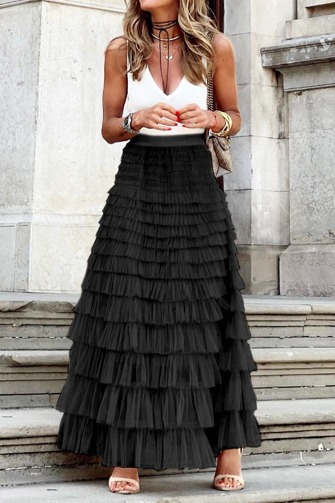 Tiered Sheer Mesh A-Line Maxi Skirt