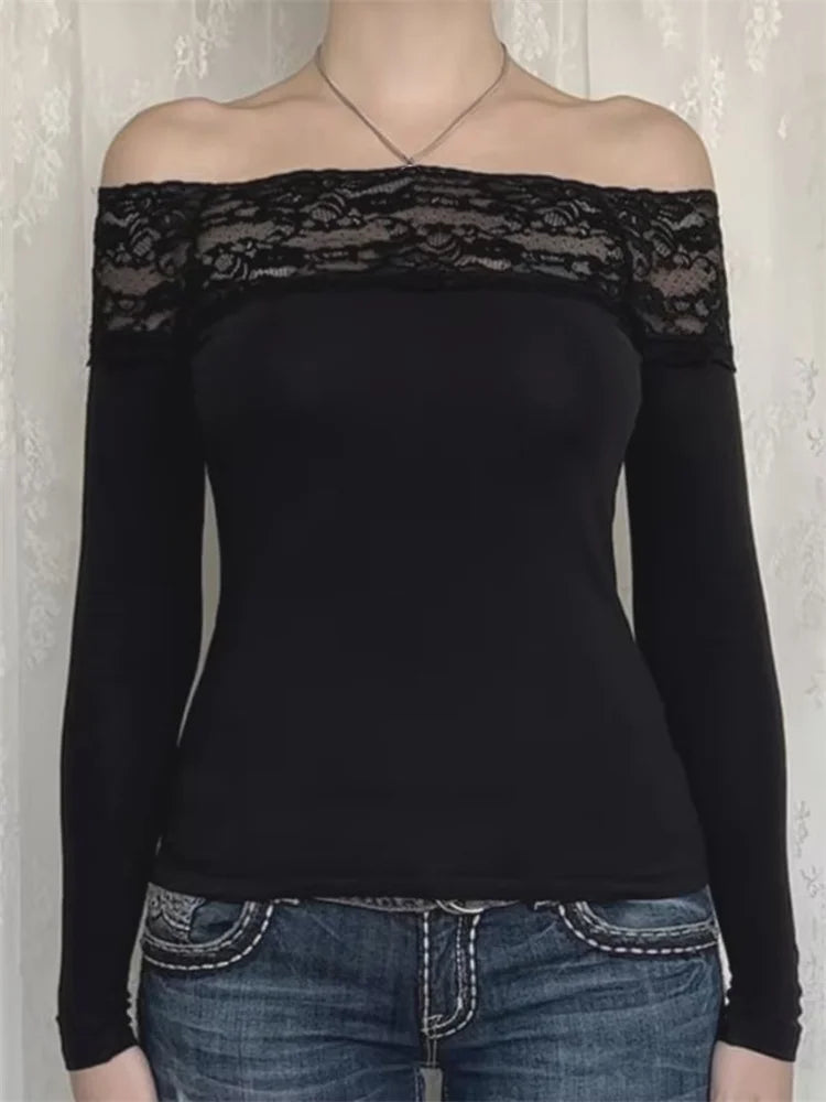 Vintage Lace Patchwork Cropped Off Shoulder Long Sleeve Slim Fit Party T-shirts